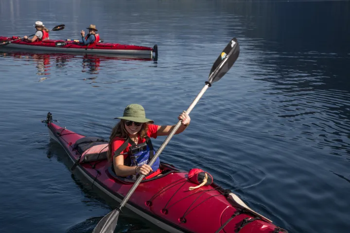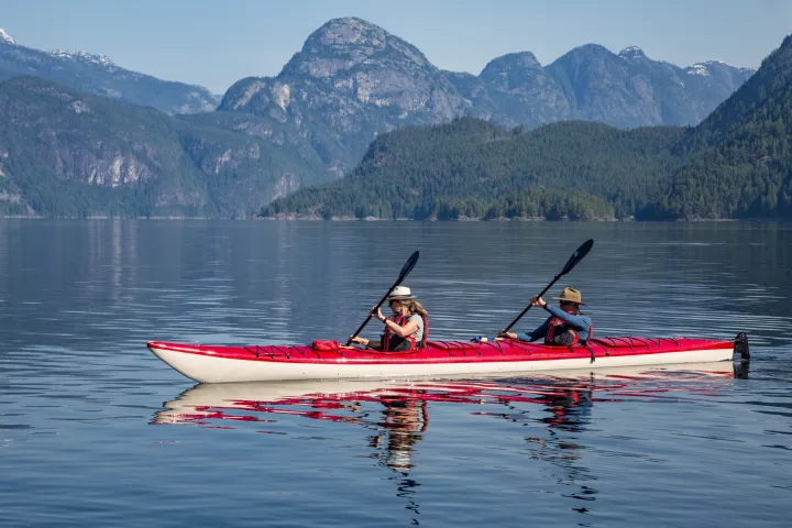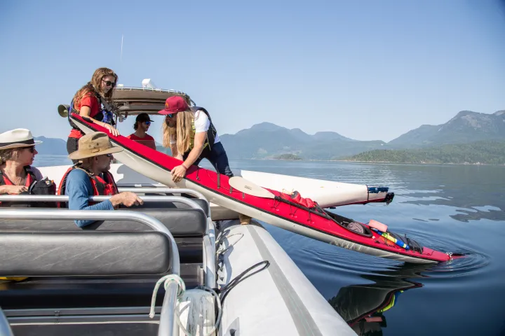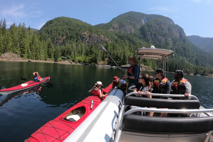 Once into Hotham Sound, you will slip into your kayak and paddle to Freil Falls, which at 1,400 feet tall is considered to be the longest free-standing waterfall between here and Alaska. Depending on the time of year and the amount of recent rainfall, the sound of the falls has been compared to thunder; don’t be surprised if you can hear it from a mile away.